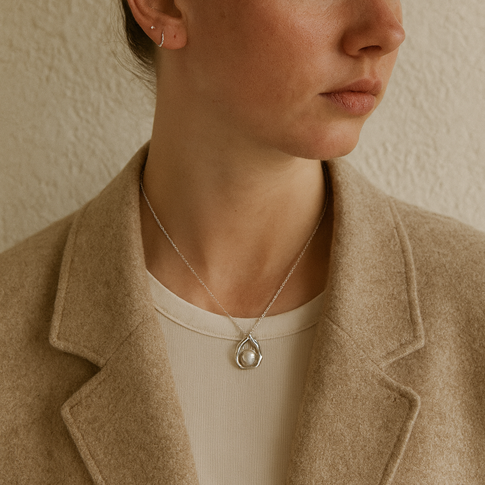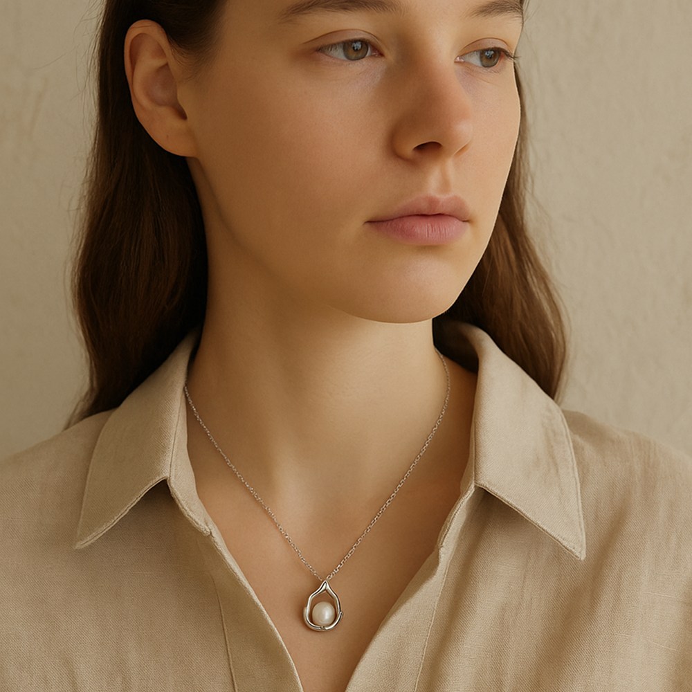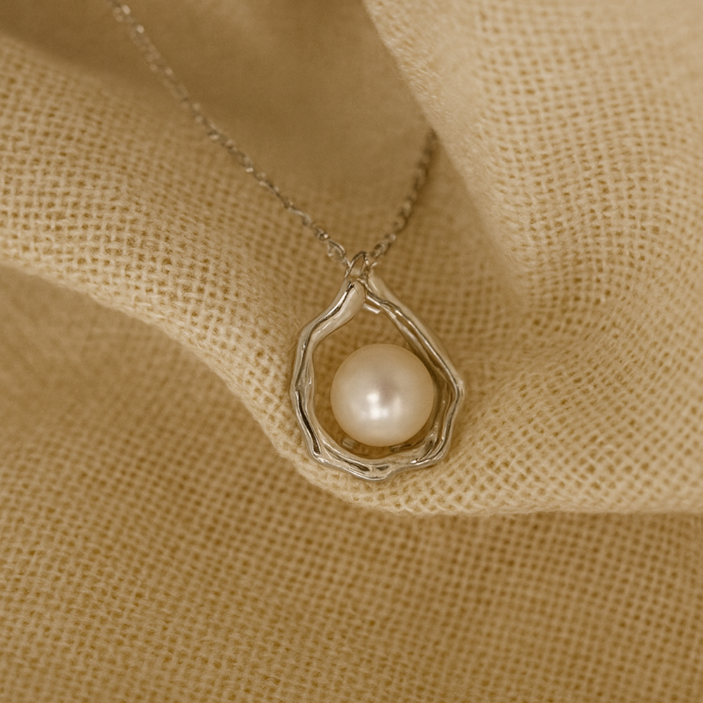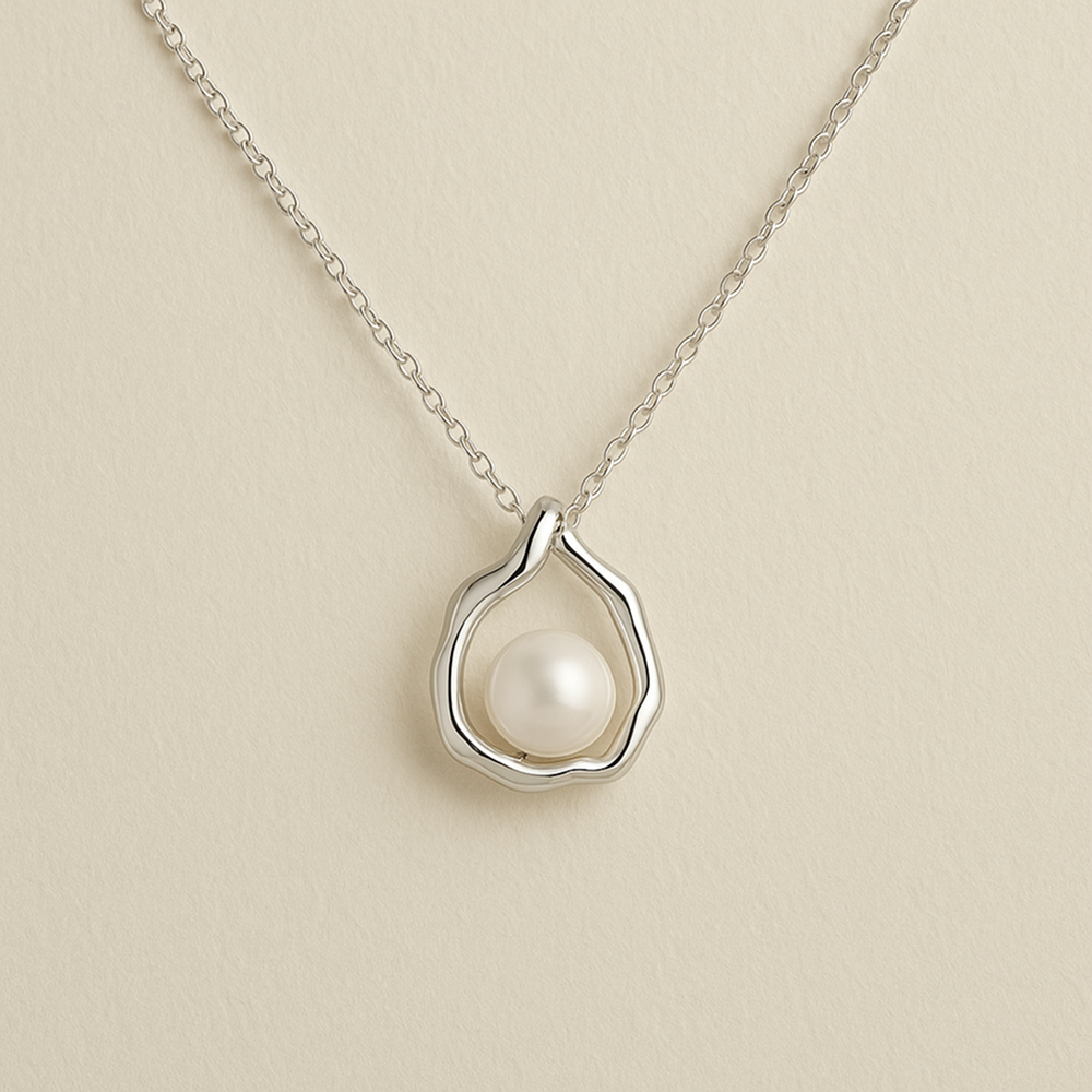Made from high-quality 925 sterling silver, it features an organically shaped pendant holding a luminous freshwater pearl.